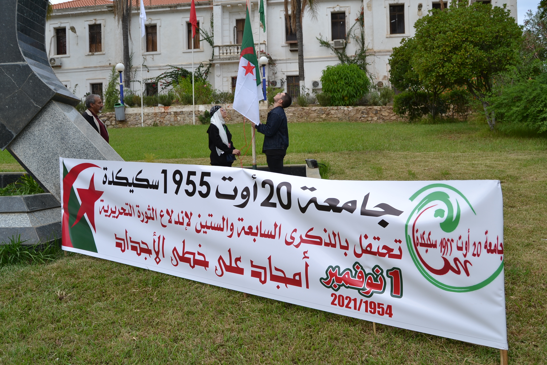 عشية الذكرى السابعة و الستون لاندلاع ثورة التحرير و تحت شعار أمجاد على خطى الأجداد و أمام النصب التذكاري بحدائق الجامعة، وقف صباح اليوم الأحد 31 اكتوبر 2021 طلبة ، أساتذة و إداريين من الأسرة الجامعية لجامعة 20 اوت 1955- سكيكدة بمعية ممثلي التنظيمات الطلابية و ممثلي النوادي العلمية و الطاقم الإداري يتقدمهم مدير الجامعة البروفسور سليم حداد احتفالا بهذه الذكرى العظيمة بوضع إكليل من الورود و قراءة الفاتحة ترحما على أرواح الشهداء الأبرار و من لحق بهم من المجاهدين الأحرار تخليدا لتضحياتهم و بطولاتهم .