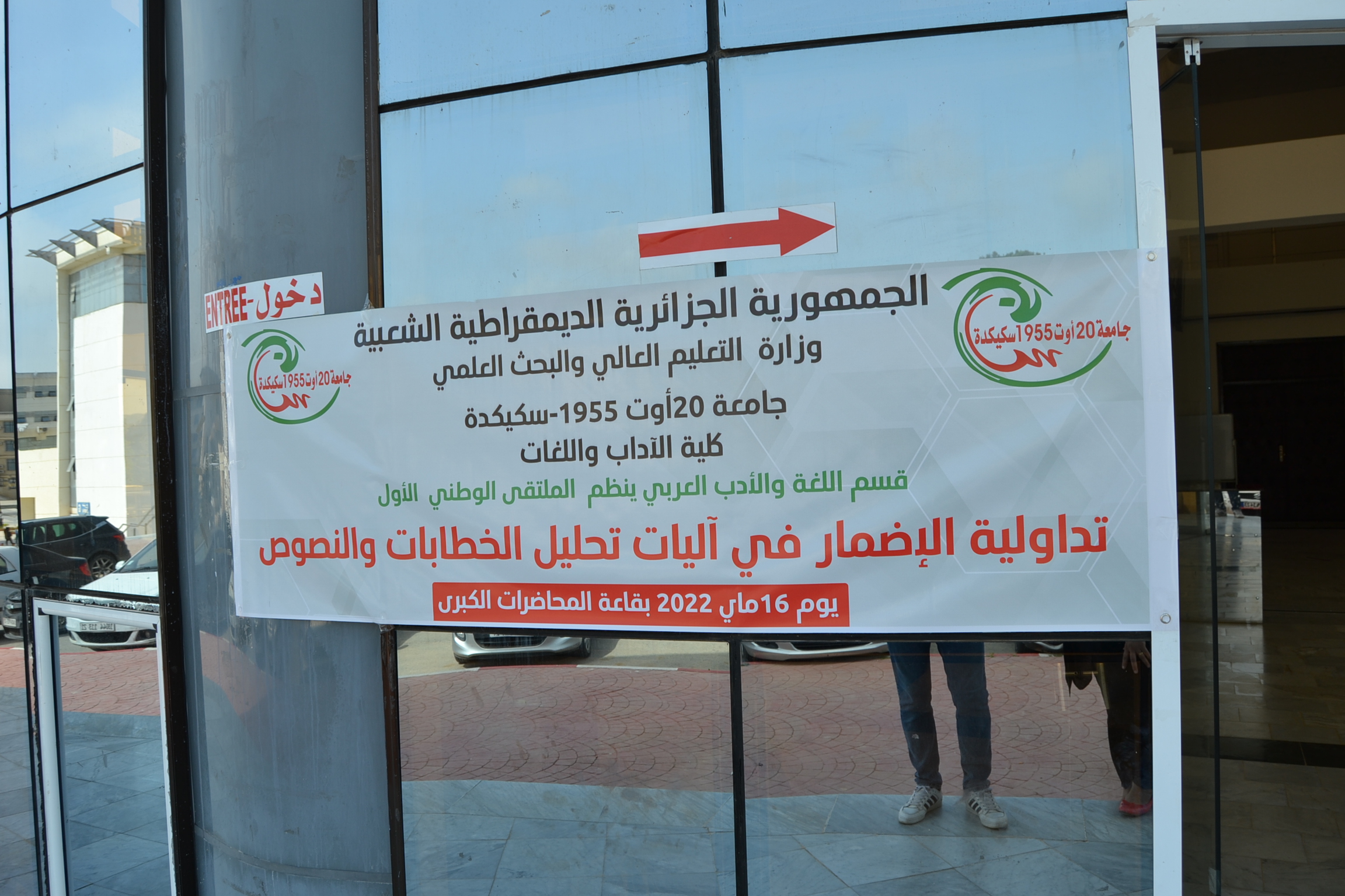 نظم قسم اللغة و الأدب العربي لجامعة 20 اوت 1955- سكيكدة ، اليوم 16 ماي 2022 ، الملتقى الوطني الأول حول تداولية الاضمار في آليات تحليل الخطابات و النصوص بقاعة المحاضرات الكبرى.  و قد أشرف السيد نائب مدير الجامعة للبحث البروفسور عثماني عمارة على إفتتاح فعاليات الملتقى في حضور الطاقم الإداري للجامعة من نائب مدير الجامعة للبيداغوجيا إلى عمداء الكليات و رؤساء الأقسام و أساتذة و طلبة كلية الأداب و اللغات.