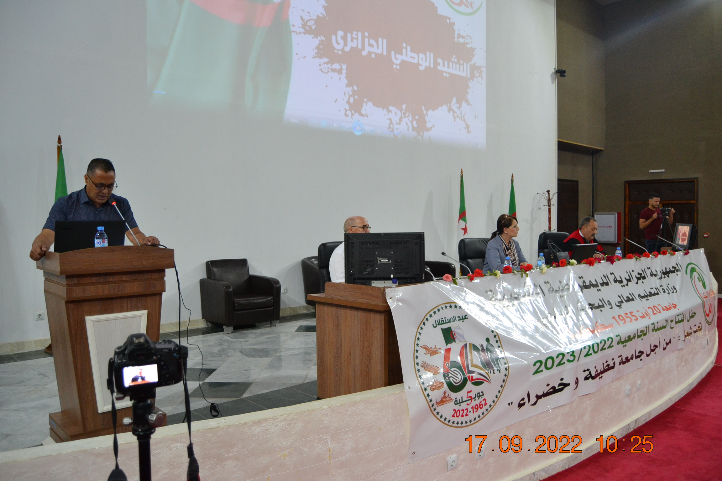 بعدها القى السيد المدير الفرعي للانشطة العلمية ، الثقافية و الرياضية كلمة السيد وزير التعليم العالي و البحث العلمي البروفسور كمال بداري بعد توليه لمنصب الوزير و الموجهة للاسرة الجامعية بمختلف مكوناتها.
