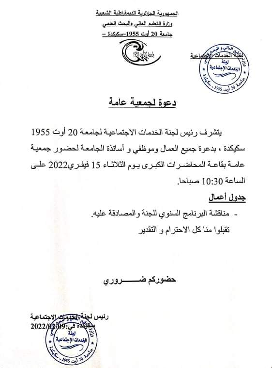 يتشرف رئيس لجنة الخدمات الإجتماعية لجامعة 20 أوت 1955-سكيكدة بدعوة جميع العمال و موظفي وأساتذة الجامعة بحضور الجمعية العامة ...المزيد