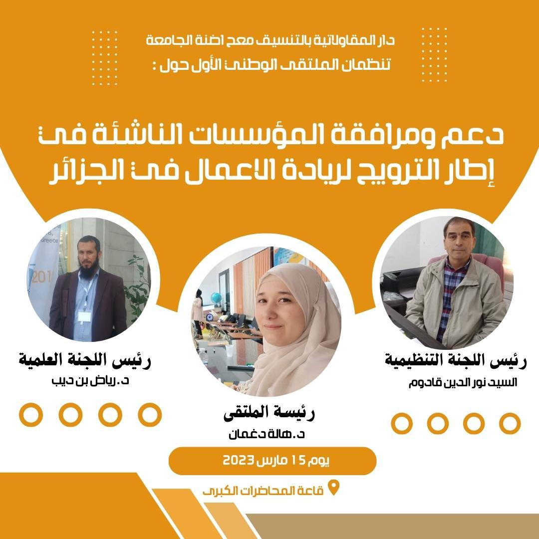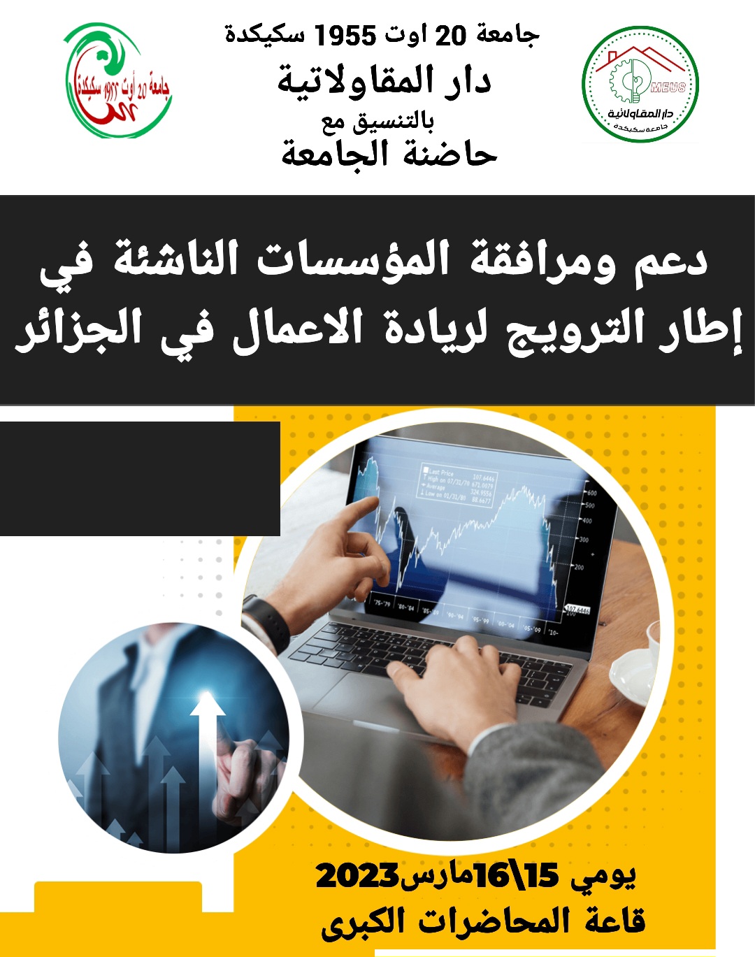 تنظم دار المقاولاتية لجامعة 20 أوت 1955- سكيكدة بالتنسيق مع حاضنة الجامعة الملتقى الوطني الأول حول دعم و مرافقة المؤسسات الناشئة في إطار الترويج لريادة الأعمال في الجزائر يومي 15 و 16 مارس 2023 بقاعة المحاضرات الكبرى