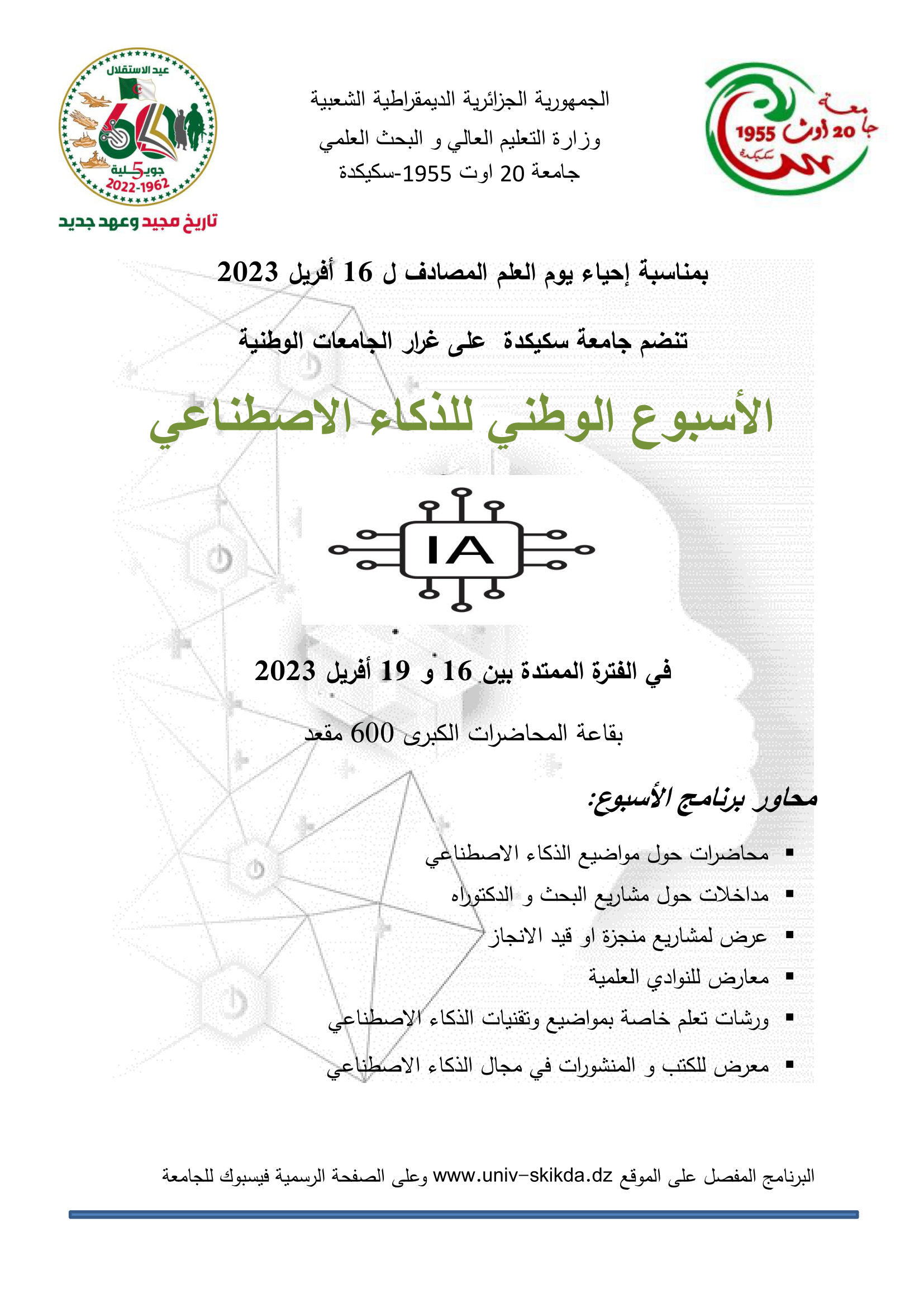 تنظم جامعة 20 أوت 1955 - سكيكدة "أسبوع الذكاء الاصطناعي"، من 16 إلى 19 أفريل 2023، بقاعة المحاضرات الكبرى 600 مقعد. البرنامج سوف ينشر لاحقا. تحميل الإعلان