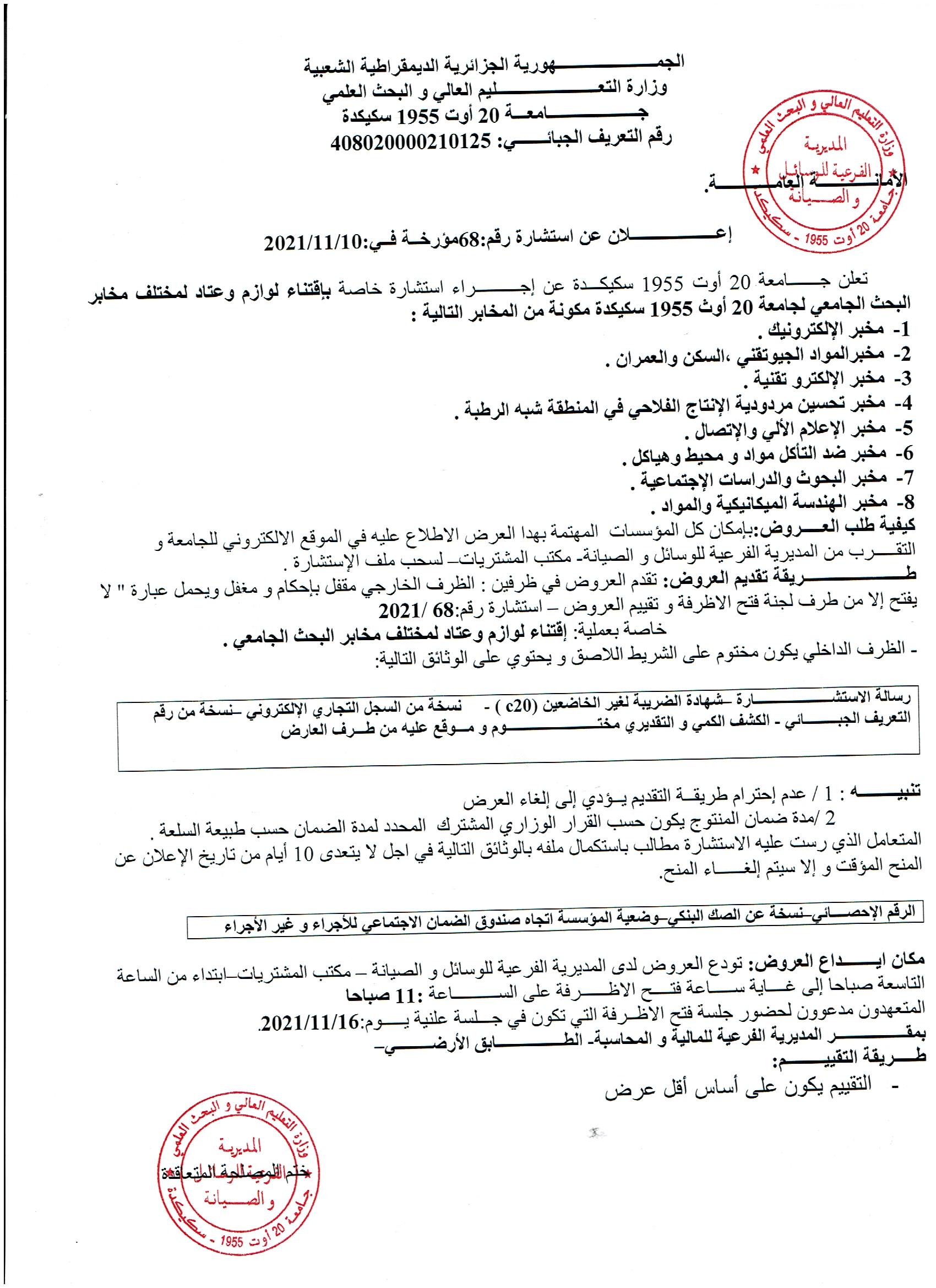 إقتناء لوازم وعتاد لمختلف مخابر البحث العلمي  لجامعة 20 أوت 1955-سكيكدة مكونة من ...