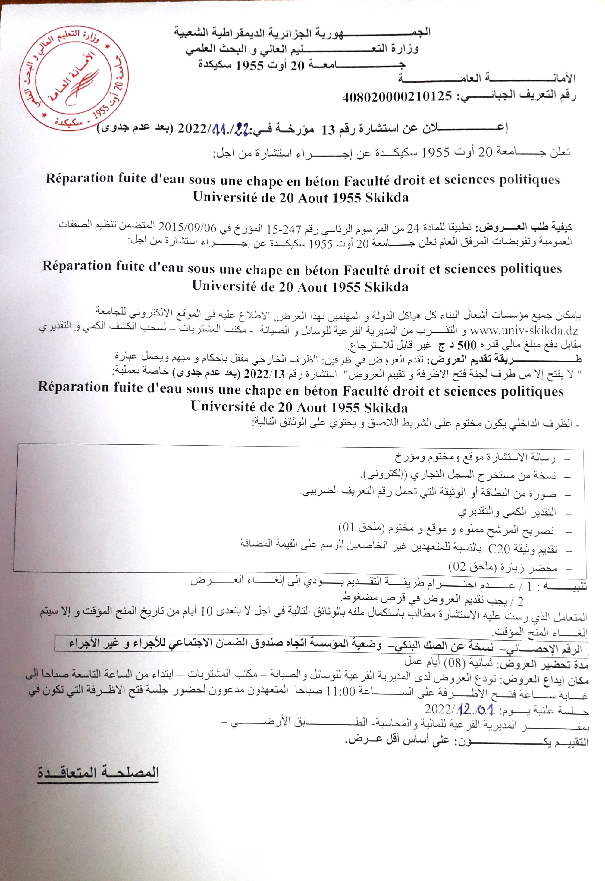 تعلن جـــــــامعة 20 أوت 1955 سكيكـــدة عن إجراء استشارة رقم 13 مؤرخة في 2022/11/21 - بعد عدم جدوى خاصة بـ: