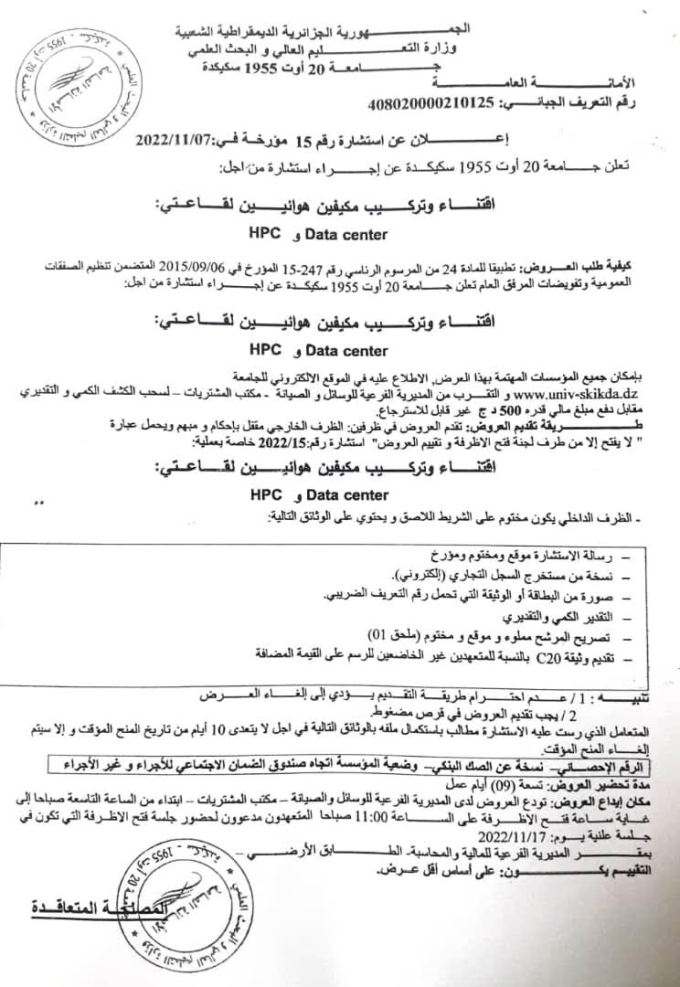 تعلن جـــــــامعة 20 أوت 1955 سكيكـــدة عن إجراء استشارة من أجل : إقتناء و تركيب مكيفين هوائيين لقاعتي HPC وDATA Center :